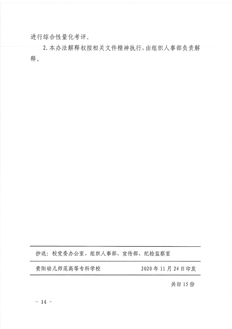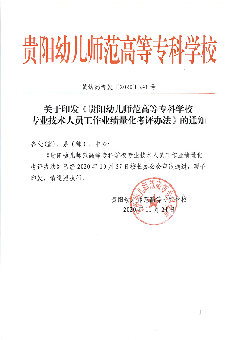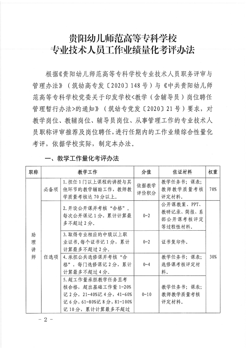 筑幼高专发〔2020〕241号关于印发《贵阳幼儿师范高等专科学校专业技术人员工作业绩量化考评办法》的通知