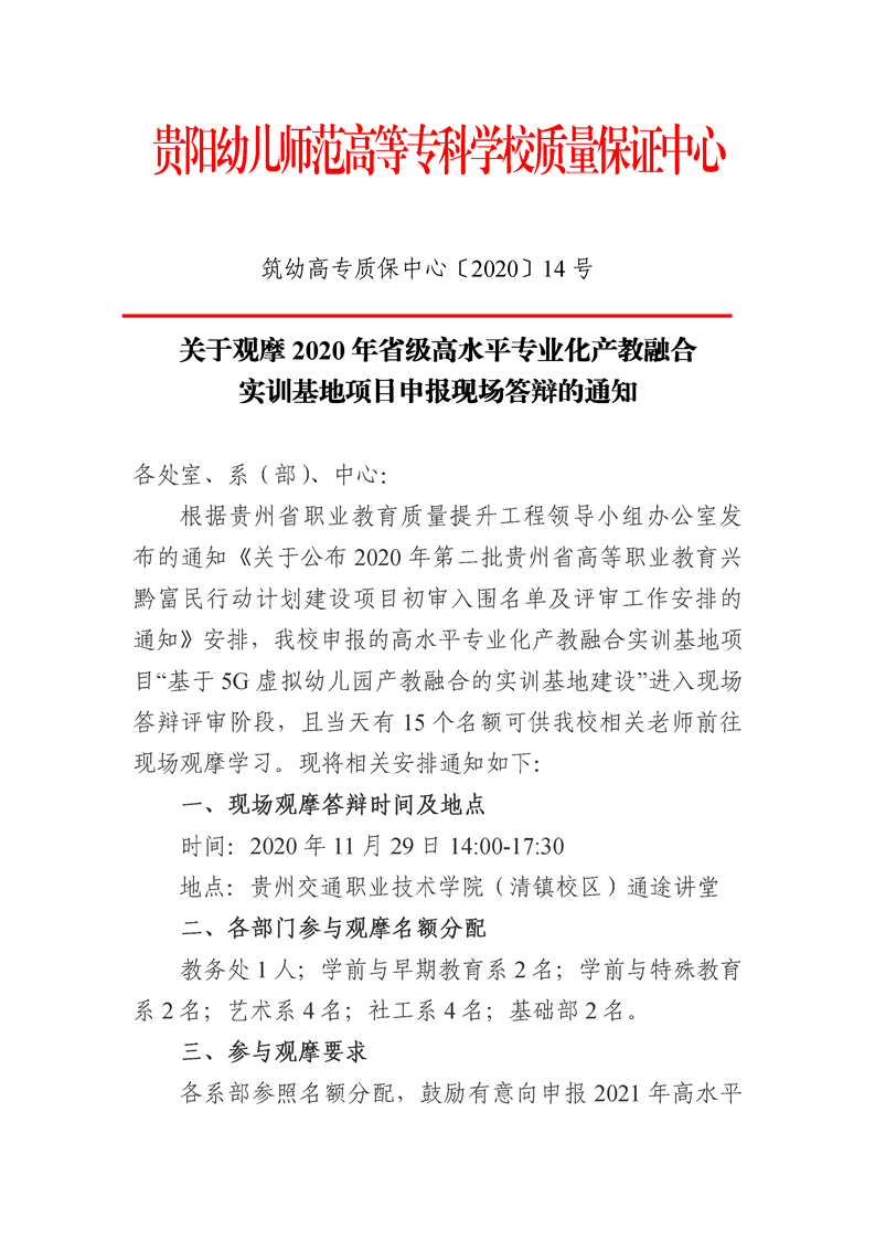 筑幼高专质保中心〔2020〕14号关于观摩2020年省级高水平专业化产教融合 实训基地项目申报现场答辩的通知