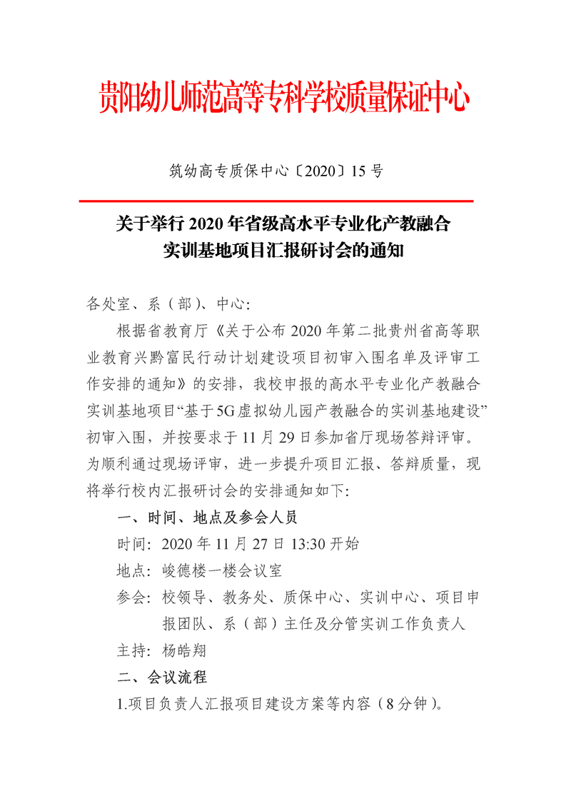 筑幼高专质保中心〔2020〕15号关于举行2020年省级高水平专业化产教融合实训基地项目汇报研讨会的通知